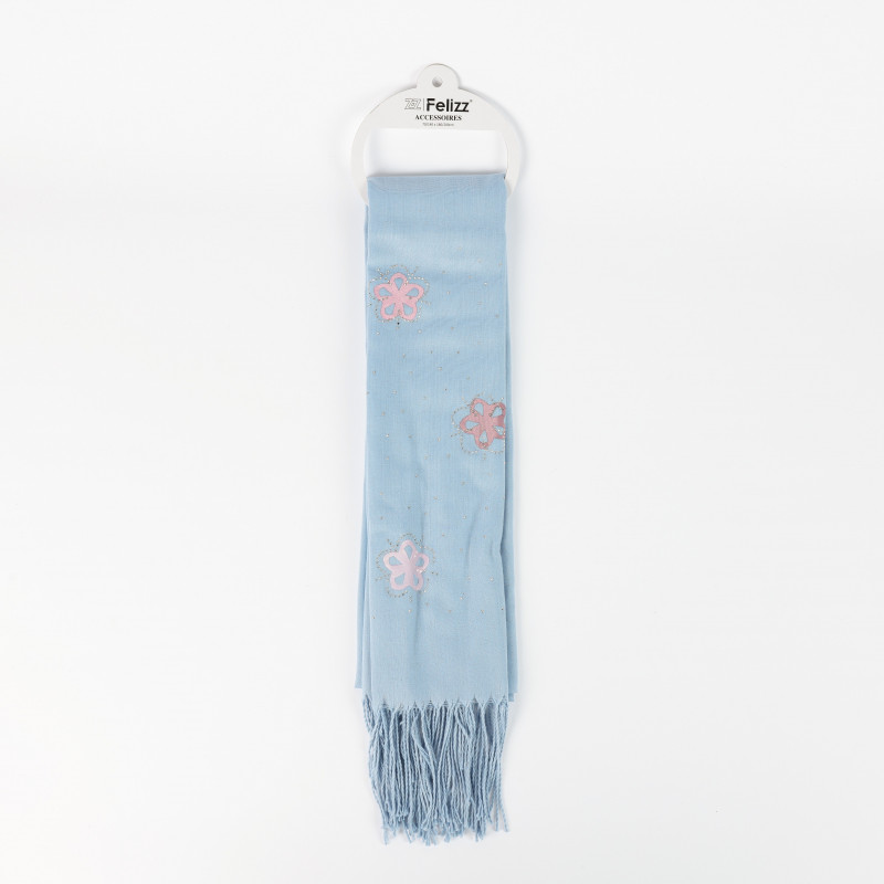 Blaues langes Halstuch mit rosafarbenen Blumen und Strasssteinen