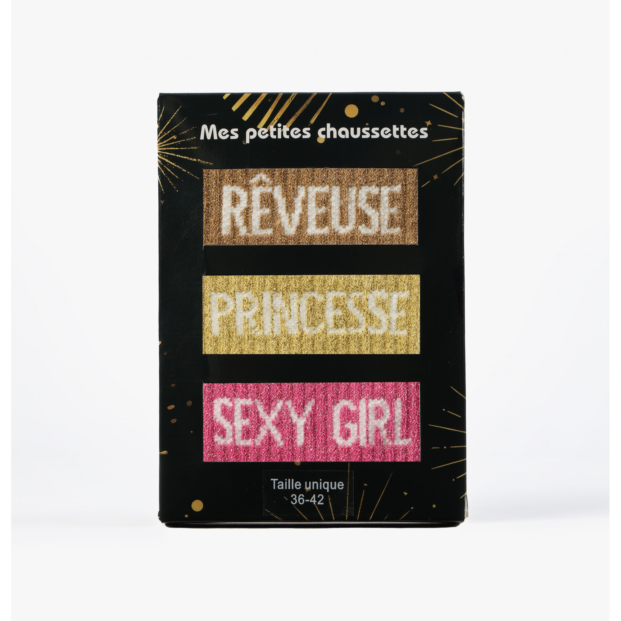 - Calcetines con mensaje de lentejuelas en cajas de 3 pares