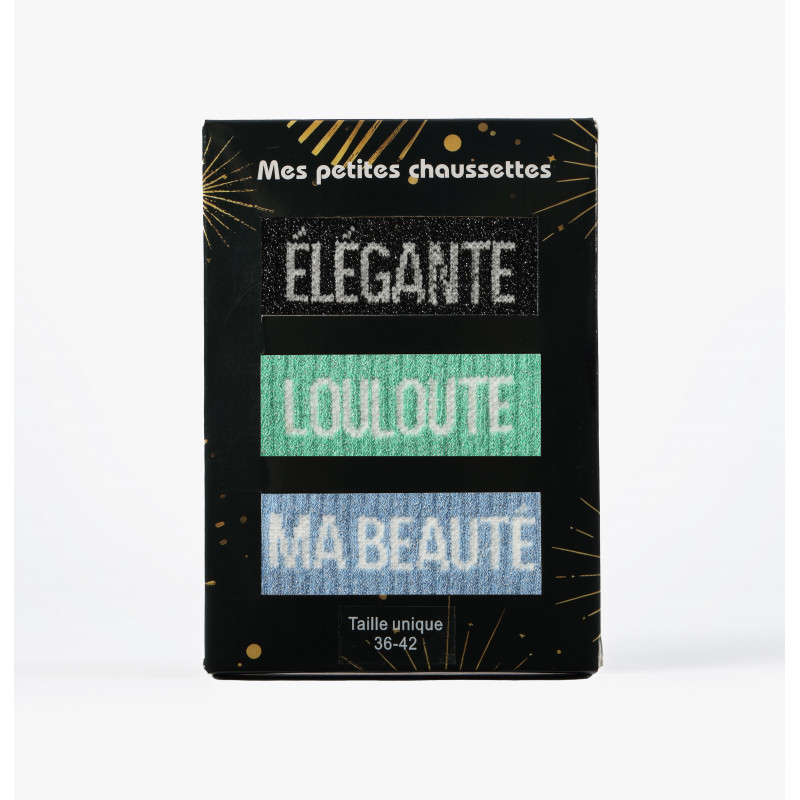 - Calzini con messaggio in paillettes in scatole da 3 paia